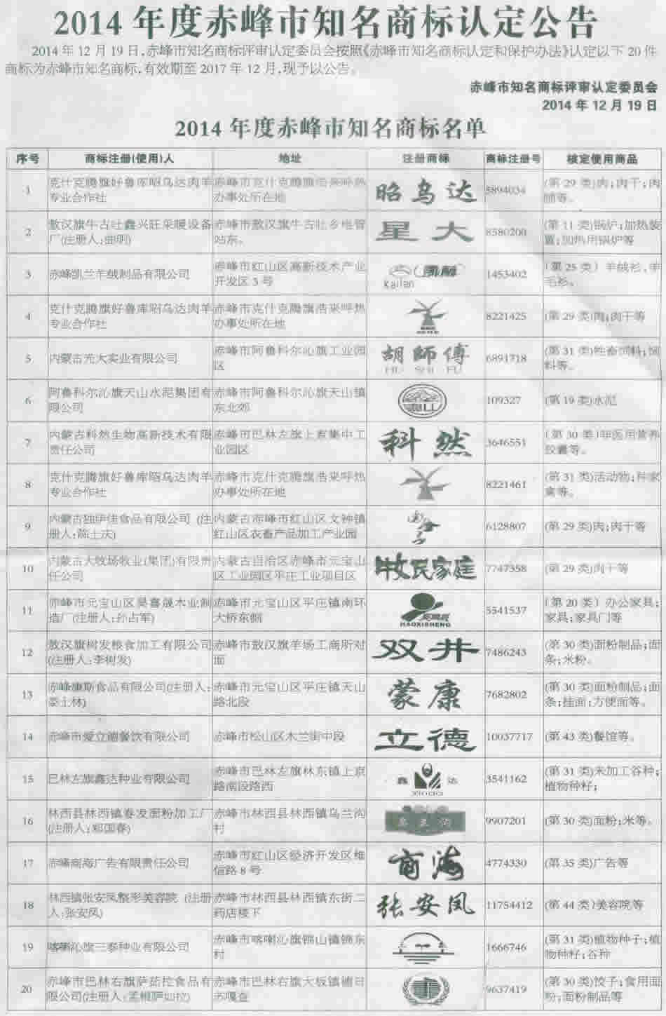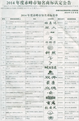 >>>2014年度赤峰市知名商标认定公告