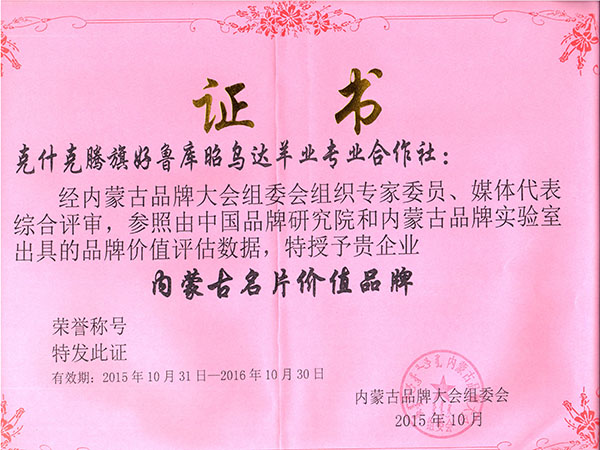 >>>内蒙古名片价值品牌证书