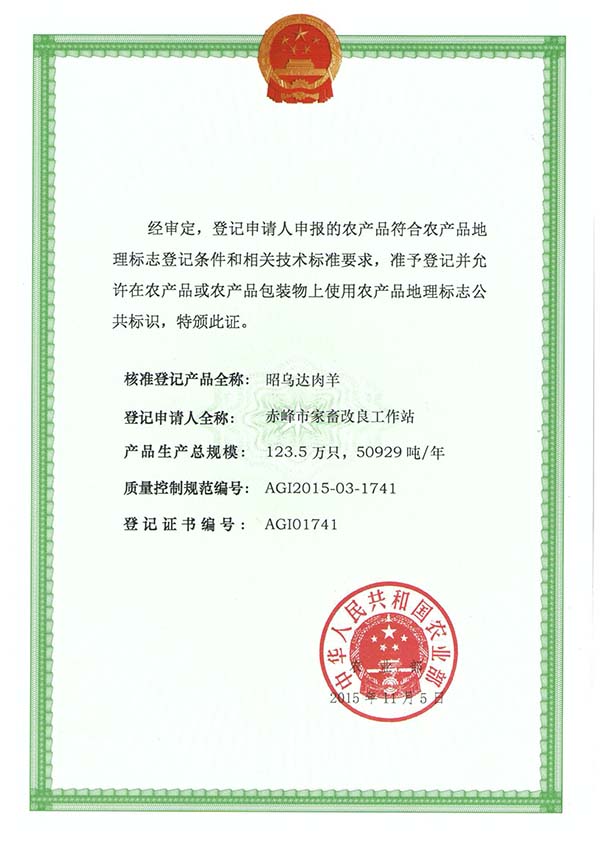 >>>昭乌达肉羊地标登记证书